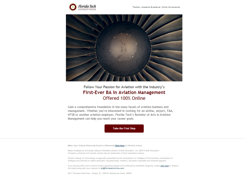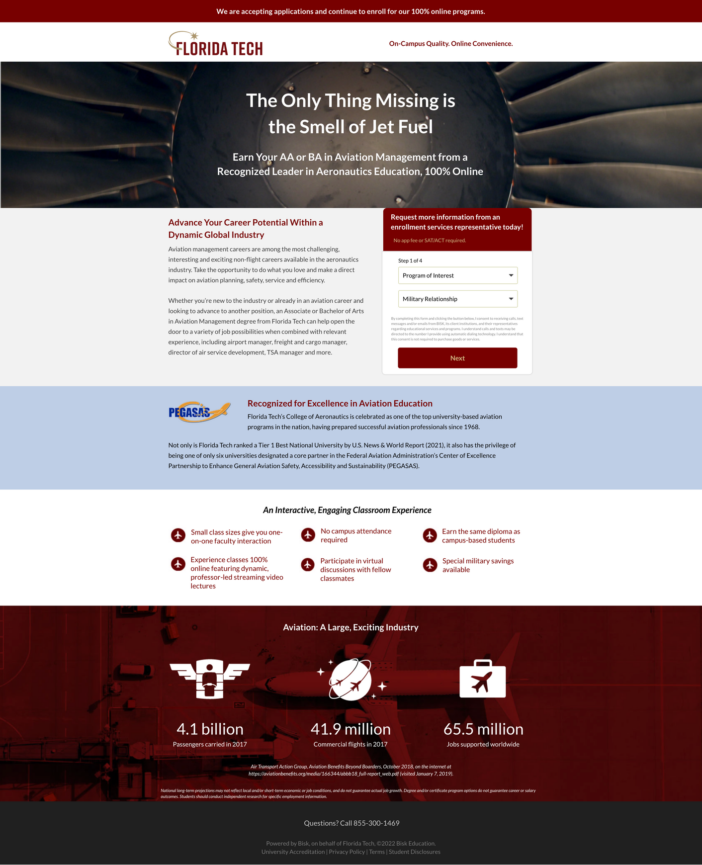 Florida Tech needed a campaign to launch its new online aviation management degree program. Target market research uncovered a valuable insight — that aviators LOVE the smell of jet fuel — which I used to build the campaign around. The campaign exceeded conversion rate goal by 119%,